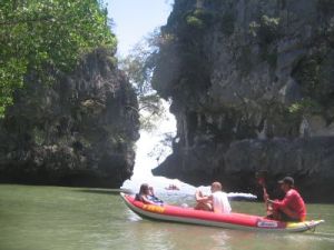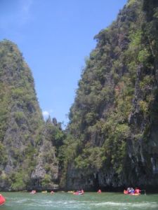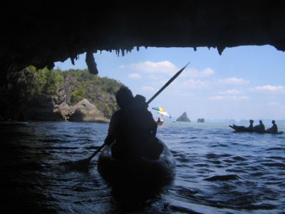 Salah satu alasan yang membuatku tertarik mengikuti tur ke James Bond Island yaitu berkano menyusuri gua-gua di perairan, tepatnya di Phang Nga National Park. Berdua atau bertiga dengan pendayung, kano meluncur untuk menikmati pemandangan stalaktit dan menikmati pemandangan alam yang menakjubkan.