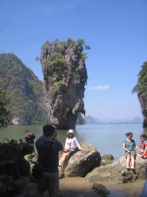 Di James Bond Island tur mulai pukul 10-17. Kami naik long tail menyusuri rawa-rawa lalu baru ke samudera. Pmandangannya keren banyak karang-karang di kiri dan kanan perairan. Setelah tiba di daerah Panyee kami  berkano. Tiap kano 1-2 orang. Kami berkano menyusuri gua-gua. Kadang sama pemandu disuruh merebahkan badan karena guanya sangat landai. Bagus banget. Biasanya si pendayung minta tips. Beri aja 100 bath.