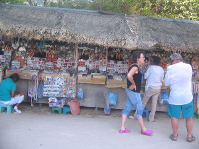 Baru di pulau tempat masyarakat muslim tinggal kami mulai asyik mengedarkan pandangan. Mereka menjual kaus-kaus bertuliskan Thailand, gantungan kunci, tempelan kulkas, kartu pos, dan hiasan meja. Yang menarik hanya tempelan kulkas bergambar panorama James Bond Island dan Phi Phi Island beraneka warna. Satu tempelan kulkas 30 bath.