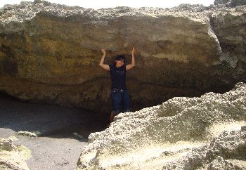 Kami disambut patung hiu di depan pintu masuk. Namun setelah kami memasuki kawasan wisata tersebut saya agak kecewa. Sepi dan tidak ada apa-apa. Hanya ada pasir pantai yang membayang sepanjang mata memandang. Namun kekecewaan ini berubah jadi sorak-sorai gembira setelah kami mendekat ke bibir pantai. Ternyata keindahan pantai ini bukan pada warna pasirnya atau langit yang menghiasinya. Karang-karangnya sangat menawan.