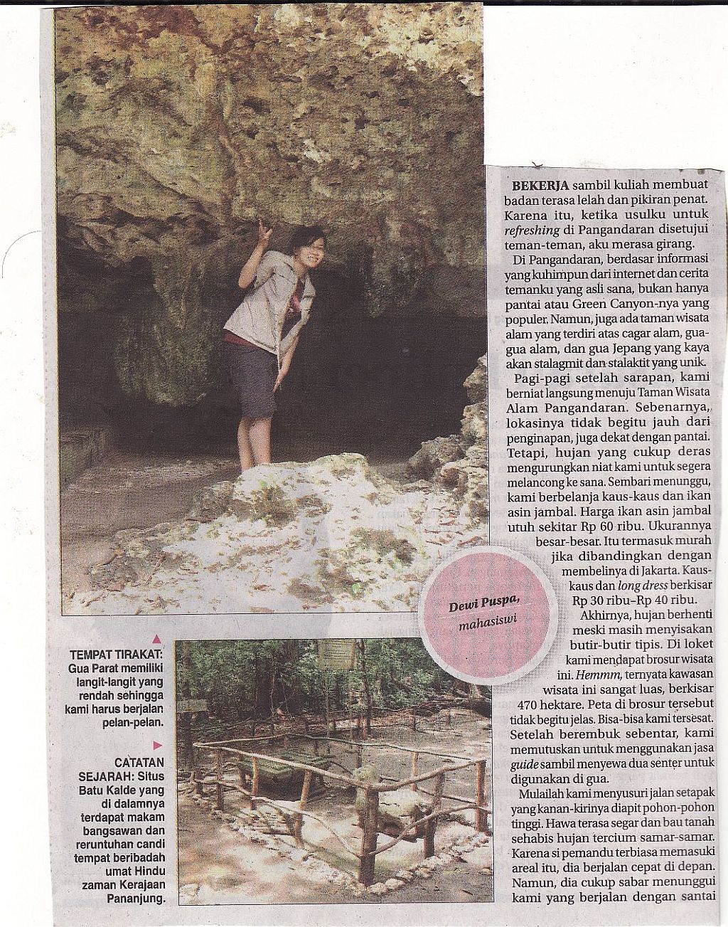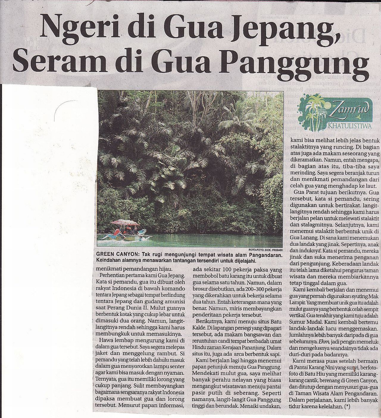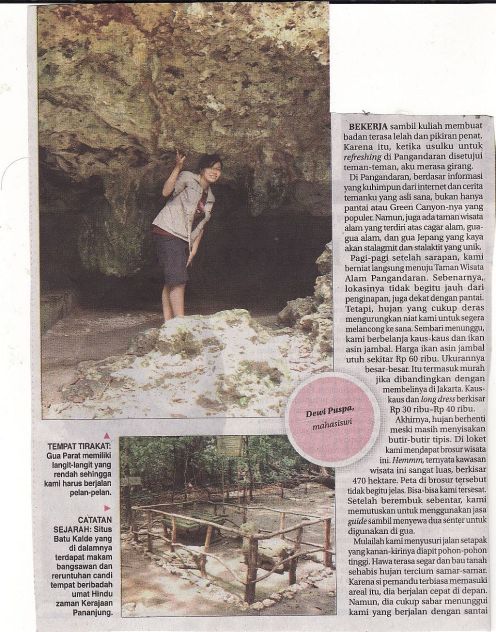 Pangandaran berdasarkan informasi yang kuhimpun dari internet dan cerita temanku yang asli sana, bukan hanya pantai atau Green Canyon-nya yang tengah populer, namun juga ada taman wisata alam yang terdiri dari cagar alam, gua-gua alam dan gua Jepang yang kaya akan stalakmit dan stalaktit yang unik.Berikut hasil catatan perjalananku selama menjelajah gua-gua yang dimuat di Jawa Pos, 3 November 2011.