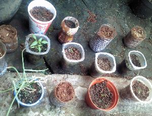 Sebagai media tanamnya, saya memanfaatkan limbah. Saya gunakan botol/gelas air mineral dan bekas tempat mie instant yang bertumpuk. Saya gunting botol separuh dan saya lubangi membentuk pori-pori di bagian bawah agar air dapat mengalir. Setelah siap, baru saya isi dengan campuran kompos dan tanah. Biji cabai pun saya benamkan. Tapi, kali ini saya tidak beruntung dalam bertanam cabai. Tidak ada satupun biji cabai yang tumbuh. Saya garuk-garuk kepala, tidak mengerti.
