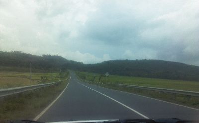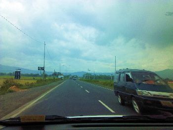 Perjalanan ini start pukul 13.30 dari Tol Rawamangun diiringi hujan gerimis. Perjalanan lancar, jalanan tidak terlalu macet. Namun, memasuki Bekasi Timur hujan turun semakin deras hingga jalanan sulit dilihat. Saya yang duduk di bangku penumpang sebelah suami yang bertindak sebagai sopir sampai memelototkan mata ke depan dan ke samping, takut jika suami melewati pagar pembatas. Hujan mulai sedikit reda di Cikarang Pusat. Kami lantas berhenti di rest area setelah tol Cikarang untuk sholat dan melemaskan tubuh.