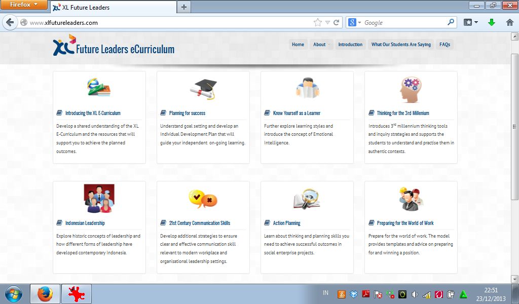 Saya tertarik untuk mencoba kursus online gratis ini. Setelah mendaftar dan login, saya melihat ada delapan modul yang ditawarkan dalam pelatihan ini. Modul-modul tersebut yaitu Pengenalan e-Curriculum (introducing the XL e-Curriculum), merencanakan kesuksesan (planning for success), mengetahui gaya belajar dan pengenalan konsep kecerdasan emosional (know yourself as learner), berpikir untuk milenium ketiga (thinking for the 3rd millenium), kepemimpinan Indonesia (Indonesian leadership), keahlian berkomunikasi pada abad 21 (21st century communication skills), perencanaan tindakan (action planning), dan persiapan ke dunia pekerjaan (preparing for the world of work).