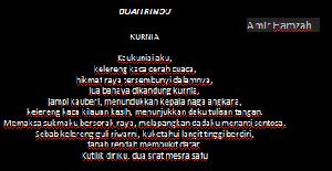 Ada beberapa karya puisinya yang saya ketik waktu SMU. Tema-tema puisinya dalam Buah Rindu tersebut kebanyakan adalah tentang spiritual dan cinta kasih. Naasnya meskipun sosok Amir Hamzah dikenal lemah lembut, kematiannya cukup tragis di tangan penjajah Belanda. Berikut salah satu puisinya dalam buku kumpulan puisi Buah Rindu.