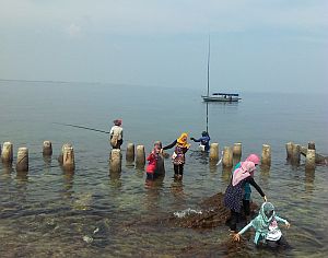 Warna air laut di sini nampak jernih kebiruan. Banyak pengunjung yang tak segan-segan bermain air, berendam, ataupun memancing. Ya, memancing menjadi salah satu aktivitas favorit di sini. Kebanyakan mereka adalah penggemar olahraga memancing yang sengaja datang sejak pukul enam pagi. Menurut salah satu bapak paruh baya yang gemar memancing, di sini ia bisa mendapatkan ikan kakap atau ikan kuwe berukuran cukup besar. Ia membawa box pendingin untuk mengawetkan ikan yang telah ia tangkap. Ikan-ikan itu sebagian ia konsumsi bersama keluarganya, selebihnya ia jual dengan hasil lumayan.
