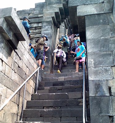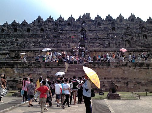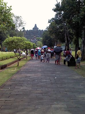 Akhirnya saya mendapatkan tiket. Musim liburan waktu itu membuat antrian cukup panjang karena banyak rombongan wisatawan para anak sekolah bersama guru dan kedua orang tuanya. Setelah memasuki gerbang masuk, kami dimintai untuk mengenakan sarung. Cara berbusana ini wajib karena kami memasuki tempat suci bagi pemeluk agama Buddha sekaligus salah satu pusat budaya dan spiritual di Jawa.