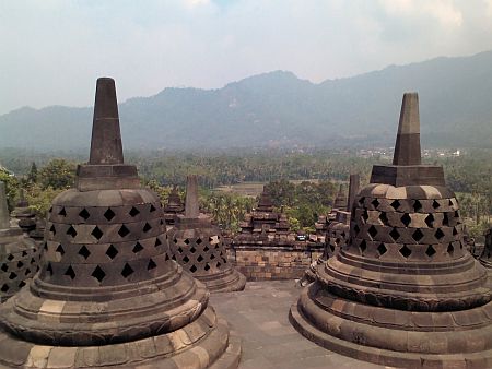 Dari tingkat paling atas candi ini saya dapat melihat bentang alam Yogya yang dihiasi pegunungan. Cantik dan nampak begitu tenteram ketika menatapnya dari tingkat atas Candi Borobudur.