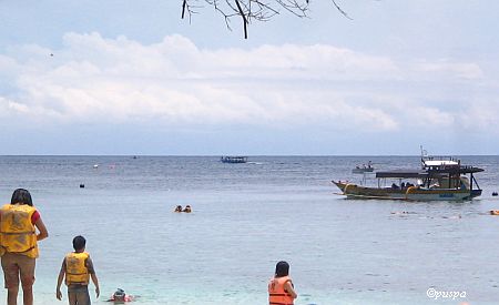 Perahu pun membawa kami berkeliling dengan bagian lantai pada perahu yang sengaja dibuat tembus pandang alias glass boat agar kami bisa menyaksikan pemandangan bawah laut. Terumbu karangnya masih terjaga dengan ikan berwarna-warni yang cantik. Tergoda untuk memandang lebih dekat, kami pun menggunakan alat snorkeling dan terjun dari perahu.