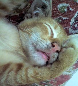 Semakin ngantuk, posenya semakin lucu-lucu dan biasanya suka berpose ala kodok penyet.Kadang-kadang ia juga suka tidur bareng dengan kucing jalanan seperti Momo dan Meme di meja teras.
