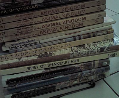 Buku-buku bersampul tebal itu banyak menampilkan gambar-gambar satwa. Aku mulai larut dan membayangkan diriku menari dengan berpegangan tangan membentuk lingkaran bersama zebra yang jahil, monyet yang cerdik, kucing hutan yang tangkas, penguin yang lugu, dan aneka satwa lainnya.