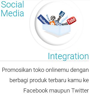 Fitur terintegrasi dengan media sosial seperti twitter dan facebook adalah fitur wajib untuk saat ini. Sehingga produk dan jasa yang ditawarkan di halaman website, juga bisa langsung dipromosikan via media sosial. Selain itu, pengguna juga dapat mengunggah produk dari instagram dan otomatis terposting di toko online.