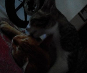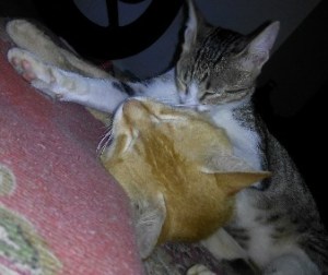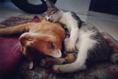 Setelah menyelesaikan jasa spanya, si Mungil jadi ketularan ngantuk. Setelah menjilati badannya sendiri ia pun jatuh tertidur menimpa badan si Nero. Untungnya keduanya sedang berhawa positif, sehingga tetap harmonis. Duh bikin gemas melihatnya.