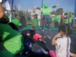 Sejak pukul 06.00 Senayan rame oleh mereka yang mengenakan kaus dan topi hijau, warna khas Anlene. Saya sendiri baru tiba pukul 06.20 lalu mengantri untuk mendapatkan kaus dan topi hijau serta sarapan berupa roti. Sekitar pukul 07.00 para anggota bloggercrony pun mulai rame. Tapi sayangnya acara tak kunjung dimulai.