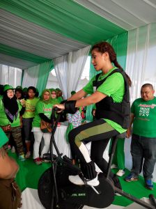 Sambil menunggu jalan sehatnya dimulai, saya dan Windhu pun jalan-jalan keliling stan. Ada arena permainan seperti trampolin untuk anak-anak dan dewasa, ada dance games, juga stan menggunakan baju lansia sehingga peserta akan merasakan bagaimana tubuh ketika berusia 60 tahun. Si cantik Meisya Siregar ikut mencobanya.