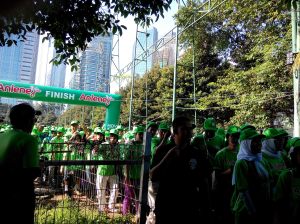 Hampir pukul 08.30 baru fun walk-nya dimulai setelah berzumba sejenak. Sebenarnya rutenya singkat tapi matahari begitu terik, panas banget. Di tengah jalan kami jajan es potong. Sampai di finish kami dapat snack, air dan pisang.
