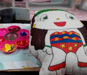 Worskhop menggambar bantal dengan Marta. Dari kecil ia memang sudah suka melakukan ketrampilan tangan. Kali ini ia akan mengajari Clozetters memberi warna pada boneka bantal Wonder Woman yang nanti akan diberikan ke Yayasan Pita Kuning Anak-anak, sebuah yayasan kanker dengan perwakilan mba Tias.