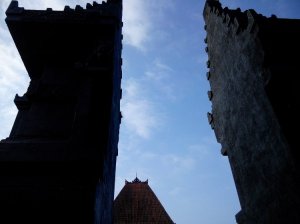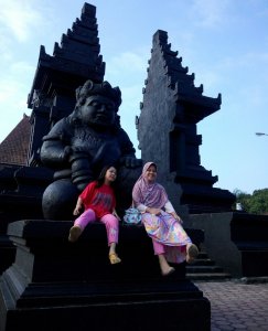 Bagian depannya sih cakep seperti gerbang candi. Juga ada tiruan Dwarapala, buto penjaga. Keponakan pun asyik berfoto di sini.