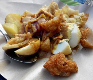 Makanannya nampak biasa saja, kurang istimewa. Mungkin karena masih banyak pedagang yang tutup hari dan jam tersebut sehingga pedagang makanan seperti ini rame juga peminatnya. Rata-rata makanannya Rp 10 ribu dan yang agak mengagetkan batagor/siomaynya per porsi Rp 12 ribu. Padahal rasa dan porsinya sih biasa saja. Wah di Jakarta malah biasanya Rp 8 ribu.