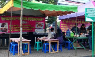 Pagi ini jalanan protokol masih sepi. Toko-toko pun masih tutup. Kami ingin berburu makanan. Tadinya aku ingin ke pasar, tapi keponakan ingin ke tempat lain. Jadilah kami menuju sekitaran Taman Krida Budaya. Di situ ada beberapa pedagang makanan dari Sego Krawu, Sego Pecel, Rawon, Nasi Kuning, Soto dan Batagor/Siomay.