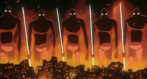 Oh ya robot ini agak mirip dengan sosok raksasa (God/Giant Warrior) dalam anime besutan Ghibli berikutnya yaitu Nausicaa of The Valley of The Wind (Ulasannya di sini). Sosok tupainya juga mirip. Sosok raksasa ini sebenarnya juga awalnya pelindung tapi kemudian menjadi sosok penghancur. Jangan-jangan kisah Nausicaa itu kelanjutan dari Castle in The Sky dimana alam bumi sudah rusak sehingga manusia mulai putus asa.