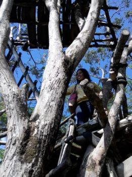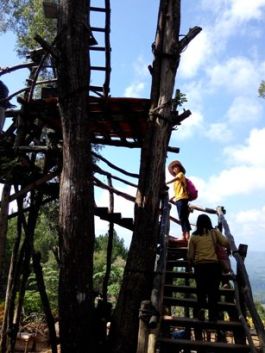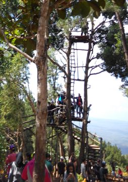 Di beberapa tempat disediakan dangau dan tempat duduk untuk beristirahat. Wah aku masih belum ingin beristirahat, kami pun kemudian menuju gardu pandang. Gardu pandangnya ada dua, aku mencobai yang tidak terlalu tinggi dulu. Wah tidak ada pengamannya nih, jadinya agak dag dig dug juga waktu naik. Ketika tiba di atas, angin lebih kencang menerpa dan pemandangan hutan dari atas nampak asri dan lebih rimbun. Aku menikmati hawa sejuk dan panoramanya yang asri dengan sukacita. Kemudian teringat turunnya jauh lebih sukses. Waduh lebih seram turunnya daripada naiknya hahaha.