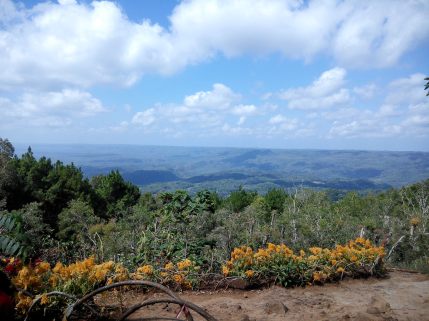 Temanku, Riap Windhu, itu benar-benar tangkas memanjat. Ia tak gentar memanjat gardu pandang yang lebih tinggi. Sementara aku hanya berani naik setengahnya. Hihihi tidak ada pengamannya, aku takut turunnya. Ternyata pemandangan di gardu pandang sebelahnya, yang lebih tinggi, itu lebih berwarna-warni. Indah dan memanjakan mata. Setelah puas menikmati panorama dan kesejukan hawa kami pun pindah lokasi. Kami menuju Kebun Buah Mangunan yang hanya beberapa menit dari Hutan Pinus Sari.