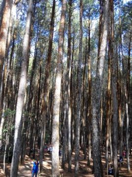 Oleh karena namanya hutan pinus maka di sana sini kami disambut oleh pepohonan pinus yang tinggi. Hari itu Yogyakarta sedang kering tidak mendapat guyuran hujan, sehingga kawasan hutan pinus ini sebagian kawasannya nampak gersang. Ada beberapa buah pinus yang berjatuha. Aku memungutnya. Dulu aku suka mengumpulkannya. Oleh kakakku buah pinus kering itu disulap menjadi kerajinan tangan di jual saat baazar.