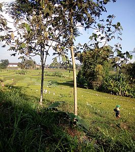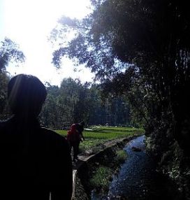 Aku semakin bersemangat. Kawasan ini begitu adem dan hijau. Sepanjang jalan terasa teduh, sisi kiri dengan hamparan sawah hijau dan si kanan dengan sungai jernih yang mengundang untuk bermain air. Aku dan pasangan pun tak tahan untuk mencobai airnya. Ah segarnya.