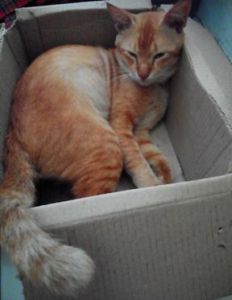 Kedua kucing itu juga demen tidur di kardus. Ada kardus kosong wah gawat, mereka langsung rebutan. Tas karton yang biasa jadi goodie bag pun juga ditempati hehehe. Ketika asyik mengatur rak buku, Si Mungil langsung menempati rak yang kosong.