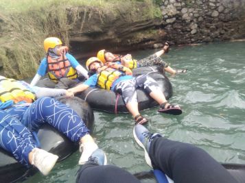 Perjalanan menyusuri sungai itu menyenangkan. Terkadang arusnya tenang, membuat penunggang ban pun mengantuk, tapi di satu momen, arusnya kemudian deras dan menukik, wah saat-saat itu bisa jadi ban terbalik atau malah mampat di antara dua batu besar. Proses melepaskan diri dari terjebak batu besar tersebut yang membuat berolah raga.