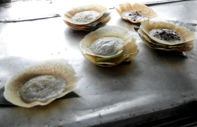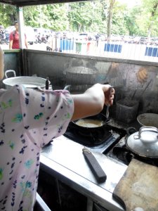 Ia mengaduk adonan yang terdiri atas tepung dan santan, kemudian menuangkannya di sebuah wajan kecil. Wajan ini kokoh berdiri di atas anglo. Ketika adonannya mengering aku malah yang dagdigdug, apakah adonannya tidak lengket? Si penjualnya dengan santai mengangkat serabi yang sudah matang dan menaruhnya di atas daun pisang. Penampilan serabinya indah, tidak koyak karena lengket di wajan.