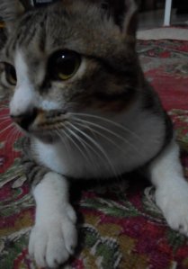 Kedua kucing lucu nan tambeng itu tiduran di atas karpet. Mereka aman dan hangat. Mereka menyambutku dengan meongannya tapi kemudian asyik bergelung. Oh mereka baik-baik saja. Si Mungil juga bisa turun dengan sendirinya. Aku merasa sangat lega. Kuelus-elus keduanya dengan rasa sayang.