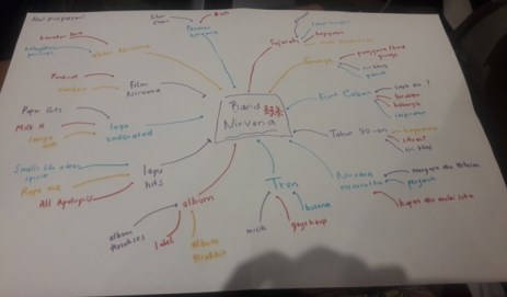 Bang Anwar Natari yang akrab dengan Away menjelaskan tentang Creative Writing Mind Mapping. Kalian pastinya pernah mendengar ya. Mind mapping ini sangat membantu dalam menguraikan ide. Ia bisa menjadi alat eksplorasi, pelengkap metode linear, visual ide, dan sebagainya. Caranya juga tidak sulit, cukup dengan meletakkan topik di tengah, kemudian gunakan garis lengkung, warna berbeda, keyword pendek, dan gambar. Misalkan jika Kalian ingin menulis tentang Nirvana, maka Kalian bisa memulai dari mana saja, dari sejarahnya, hits mereka, personelnya dan sebagainya.