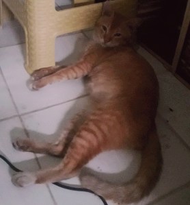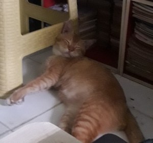 Kedua kucing makan siang dengan ikan kembung utuh masing-masing satu ekor. Hari yang indah, para kucing juga waktunya bersantai. Usai makan si Mungil langsung kembali bermain di luar,sedangkan Nero bengong melihat hawa di luar yang panas. Ia memutuskan tiduran di dalam rumah. Nero mencari spot yang adem, awalnya tidur di atas tuts keyboard kemudian pindah dekat rak buku, lalu di depan kipas angin.