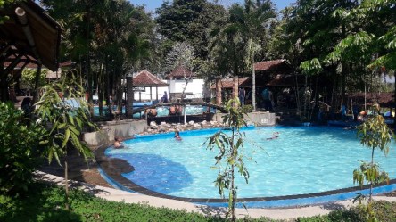 Kolam renang dengan efek pelangi biasanya jadi favorit anak-anak sambil ditemani ayah ibunya. Sambil berenang bisa menikmati panorama sawah. Wah segar deh.