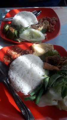 Nah waktu ke Baluran kapan waktu itu, aku juga memesan tempe penyet. Nasi disajikan dengan tempe bertopping sambal merah. Teman-temannya juga ikut menemani. Ada ikan asin dan potongan terong bakar. Wuiiih rasanya nikmat banget. Aku menyantapnya dengan lahap dan tuntas. Sambal merah dan kawan-kawannya itu menciptakan keselarasan dan menghadirkan pengalaman bersantap yang memuaskan.