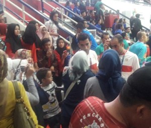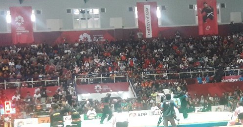 Tidak semua penonton dari Jakarta, ada yang dari luar kota dan jauh-jauh datang ingin mendukung atlet kebanggaan Indonesia. Ada pula warga asing yang juga mendukung atlet Indonesia. Kalau melihat kapasitas bangku penonton di gedung pertandingan ini bisa jadi penonton lebih dari empat ribu. Luar biasa. Untuk masalah kekompakan, warga Indonesia patut diacungi jempol.