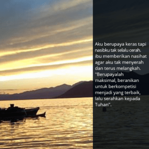 Sejak usia dini aku diajarkan untuk melakukan hal yang terbaik dan berani berkompetisi. Memang kadang-kadang aku menganggapnya sebagai beban. Tetapi, ketika aku menoleh ke belakang, aku menyadari kebenaran kata-kata Ibu. Aku mungkin akan sulit memasuki SMA favorit apabila aku tidak berupaya keras.