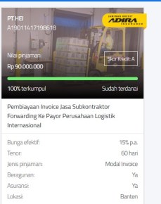 Investasinya disebut peluang pendanaan. Ada beberapa perusahaan yang mengajukan penawaran pinjaman pembiayaan. Di sini calon investor diberikan informasi tentang bunga efektif, tenor, jenis pnjaman, skor kredit, dan informasi penting lainnya. Jadi sebelum bergabung menjadi investor di proyek tersebut, Kalian bisa membaca prospektusnya dan info tentang proyek tersebut. Besaran profitnya beragam, ada yang mencapai 18 persen.