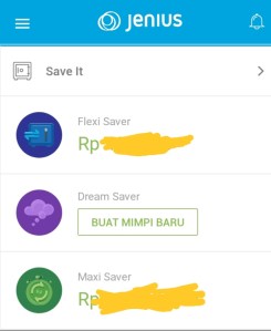 Jenius menawarkan empat jenis tabungan dengan satu akun. Yang pertama adalah tabungan yang fleksibel bernama Flexi Saver. Kita bisa menabung di sini sesukanya tanpa biaya administrasi. Bunga hariannya lumayan ada 5%/tahun.