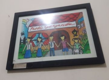 Pada saat pagi hari mereka berlatih motorik di halaman wisma. Kegiatan memang lebih banyak seputar melatih motorik dan terapi berbicara. Kegiatan lainnnya berupa makan berat dan snack sebanyak lima kali dalam sehari, kemudian melakukan aktivitas berkaitan dengan minat dan kemampuan mereka. Aku melihat ada beberapa gambar buatan mereka.