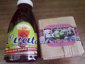 Aku mendapatinya di sebuah toko oleh-oleh di Bontang. Sebotol kecil sirup mangrove dijual Rp 25 ribu. Warna sirupnya merah kecokelatan dan lumayan kental. Untuk cokelat juga harganya sama. Kemasannya dari semacam bambu, tapi waktu itu aku tak membelinya. Baru ketika pulang aku agak menyesal.