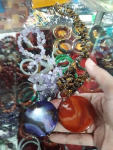 Di bagian lain ada banyak kalung dan gelang dari bebatuan dan manik-manik. Dulu aku suka mengoleksinya. Banyak koleksiku yang rusak tapi masih kusimpan. Aku memutuskan membelinya. Satu untuk kawanku, satu untuk kakak, dan satu buatku. Harganya tak mahal. Berkisar Rp 50 ribuan.