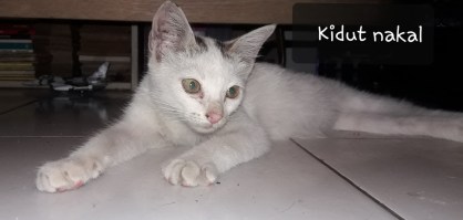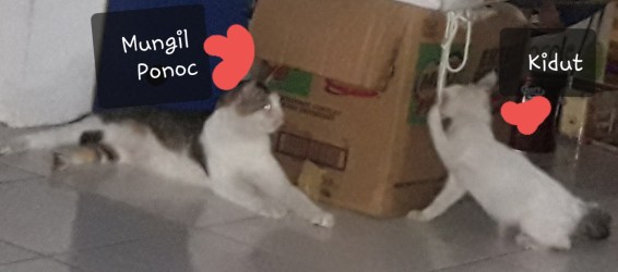 Rumahku sejak bulan puasa lalu kedatangan penghuni baru. Ia kucing kecil dengan warna putih dan sedikit ornamen warna hitam, mirip dengan induknya. Kucing kecil itu adik si Mungil Ponoc, tapi beda ayah karena jenis bulu dan ekornya berbeda. Ponoc yang sudah tak mungil lagi berekor pendek alias bundel. Sedangkan adiknya yang kuberi nama Kidut berekor panjang.