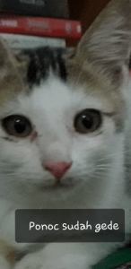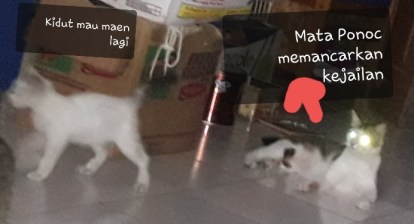Sepertinya Ponoc memerhatikannya. Ia nampak ingin ikut bermain. Sayangnya Ponoc ini bongsor. Ia baru berusia tujuh bulan tapi sekarang tubuhnya sudah lumayan besar. Dulu ia seperi gumpalan kapas mungil karena bulunya panjang dan halus.
