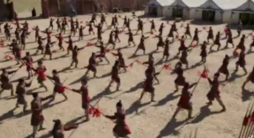 Lalu adegan bergeser ke sebuah pertempuran. Mulan menyamar dengan pakaian pria dengan nama Hua Jun untuk menggantikan ayahnya yang telah menua. Tapi kemudian di beberapa adegan Mulan nampak bertarung dengan baju yang biasa ia kenakan dan rambut tergerai. Ia berlarian, memanah, dan kemudian nampak tak kenal takut untuk melawan.