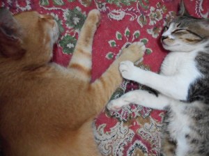 Saat berangkat kerja juga sama frustasinya. Mereka minta makan. Empat eh lima sekaligus. Si Kidut, yang paling kecil, yang paling nyaring dan paling berisik suaranya, seperti burung pipit. Kemudian satu-persatu pun mereka dikeluarkan agar mereka berolah raga dan terkena sinar matahari. Tapi bukannya senang bermain di luar, mereka lebih suka tiduran di dalam rumah dengan kipas angin. Nyaman dan adem kata mereka. Satu berhasil dikeluarkan lainnya masuk lagi ke dalam. Kucing-kucingan eh ini kucing beneran.