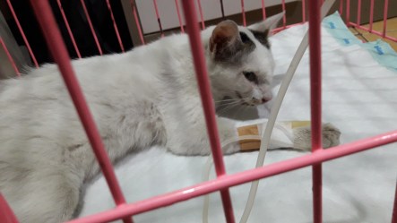 Hasil lab menunjukkan kucing ini dehidrasi parah dan anemia. Hidungnya beringus dan bercampur darah. Huuh. Ia harus diopname. Aku kasihan melihatnya disuntik. Ia harus diinfus karena ia sudah tak makan cukup lama dan kekurangan cairan.