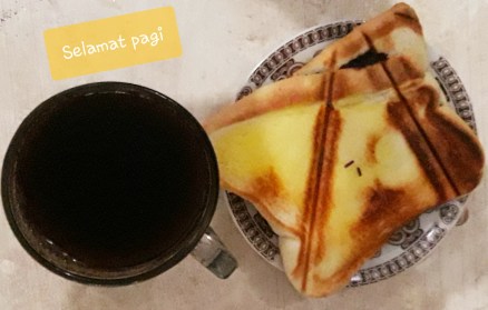 Setelah si Kidut puas bereksplorasi aku pun menyiapkan sarapan. Si Kidut Junior mulai belajar makan. Ia baru bisa makan makanan yang basah dan halus seperti bubur bayi. Aku sarapan roti bakar yang kubuat seadanya. Hahaha bentuknya tak menarik. Tak apalah. Isinya misis cokelat dan keju. Sebagai temannya kopi rempah-rempah dari Ternate.